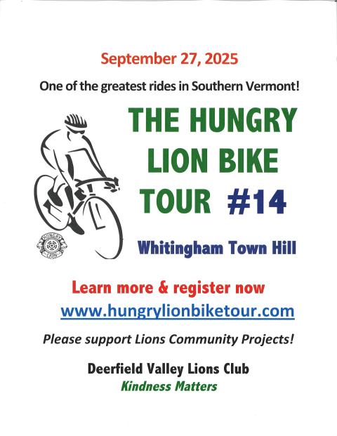 Come on our for the Hungry Lion Bike Tour (14th annual) on September 27, 2025. All rides start at Town Hill in Whitingham. All proceeds support the Lions Community Projects.