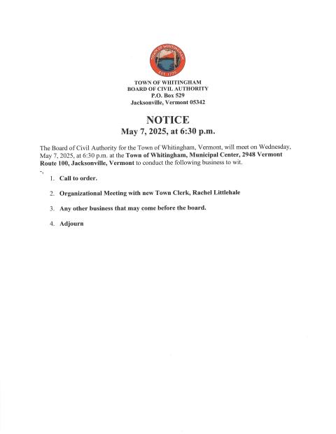 The Whitingham Board of Civil Authority will meet on Wednesday, May 7, 2025 at 6:30pm in the Whitingham Municipal Center to follow the agenda attached below.