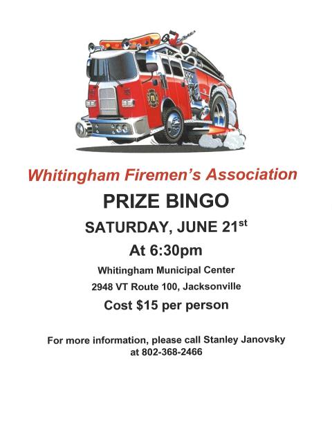 Come on down to the Municipal Center on Saturday, June 21st at 6:30pm for prize BINGO! $15 per person. Proceeds to benefit the Whitingham Firemen's Association.