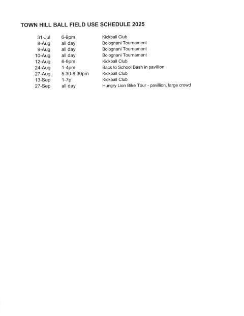The attached schedule shows dates and times that the ballfield and/or pavillion will be in use.