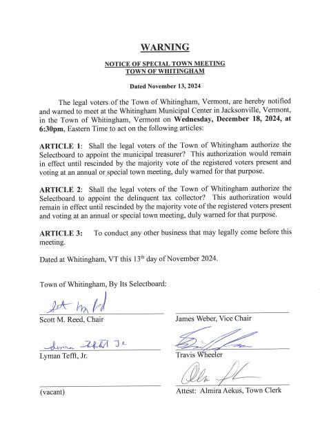 The legal voters of the Town of Whitingham, Vermont, are hereby notified and warned to meet at the Whitingham Municipal Center in Jacksonville, Vermont, in the Town of Whitingham, Vermont on Wednesday, December 18, 2024, at 6:30pm, Eastern Time to act on the following articles: