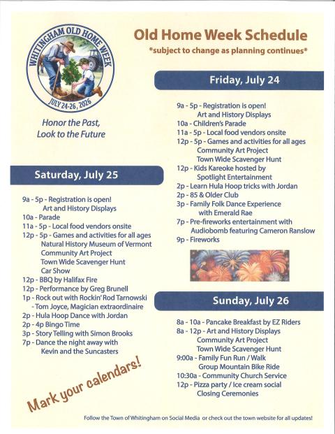 Attached is the working copy of the schedule for Old Home Week 2026, it will likely be updated from time to time.