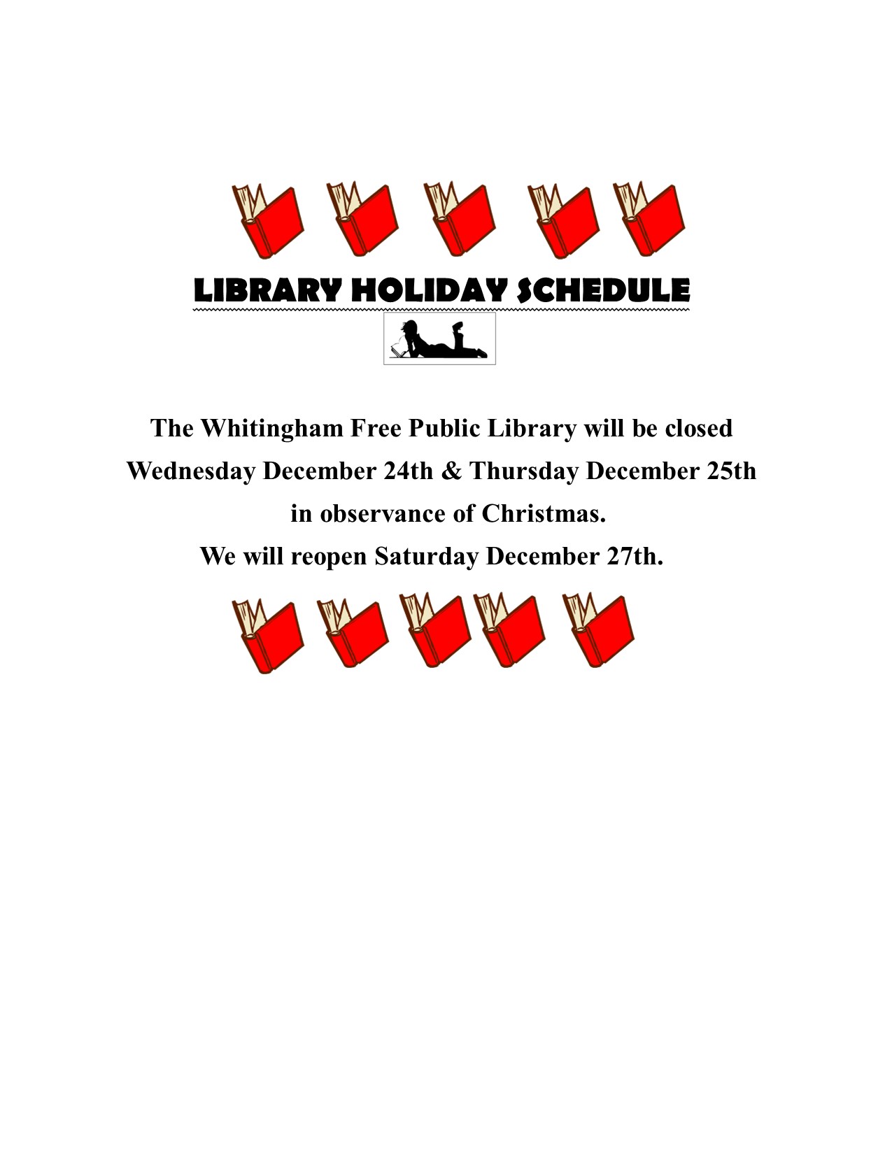 The library is CLOSED WEDNESDAY DECEMBER 24TH & THURSDAY DECEMBER 25TH IN OBSERVANCE OF CHRISTMAS.